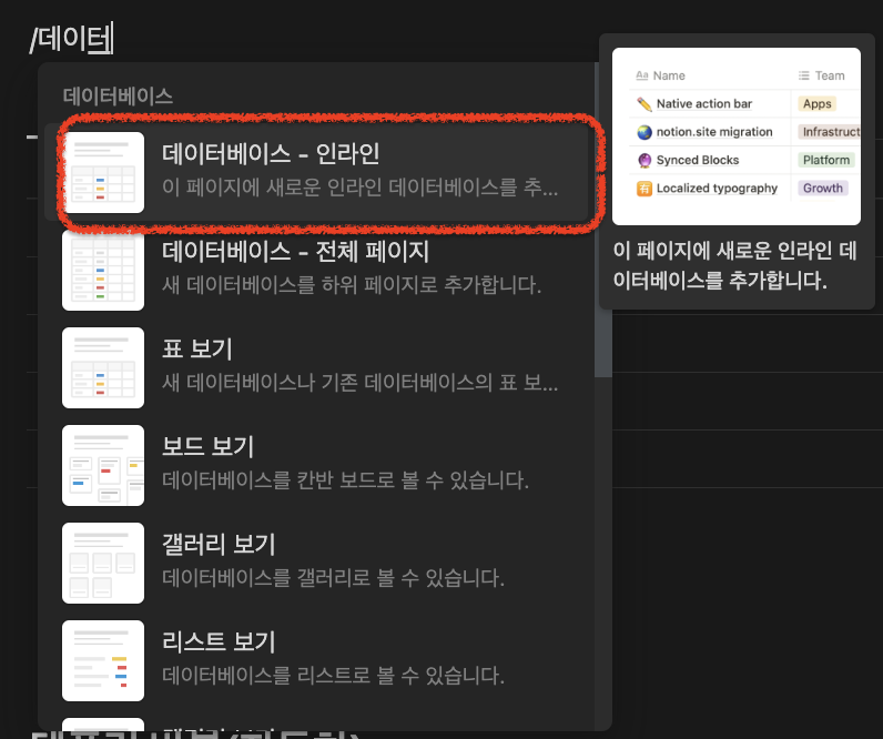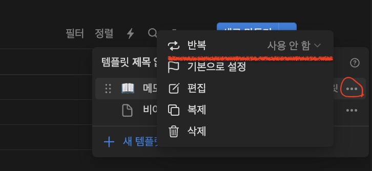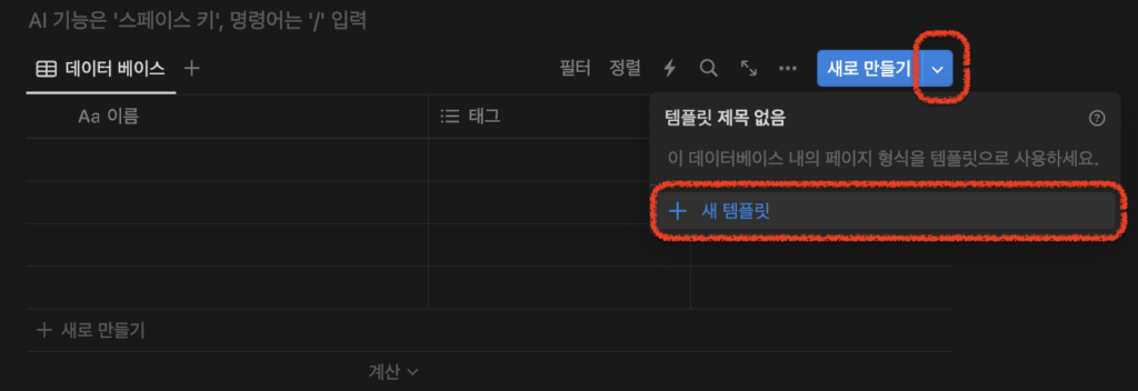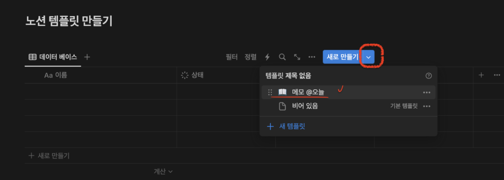 /데이터베이스 - 인라인 클릭 → 새로 만들기 옆에 아래 화살표 클릭 → 새 템플릿