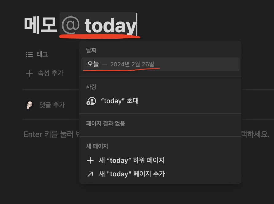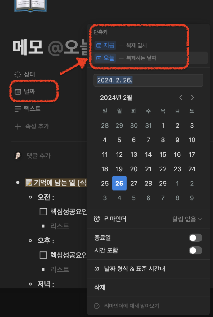 + 속성추가버튼을 클릭하면 날짜를 오늘/지금 또는 원하는 날짜로 변경할 수 있습니다. 종료일 추가나 시간 포함도 가능하며, 형식 변경도 가능합니다. 또한, 리마인더(알림) 기능이 있으니 원하는 대로 수정해 보세요.