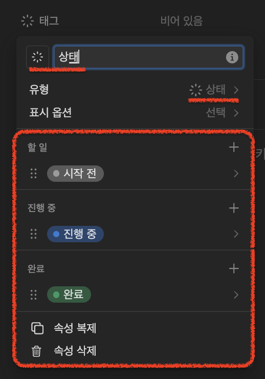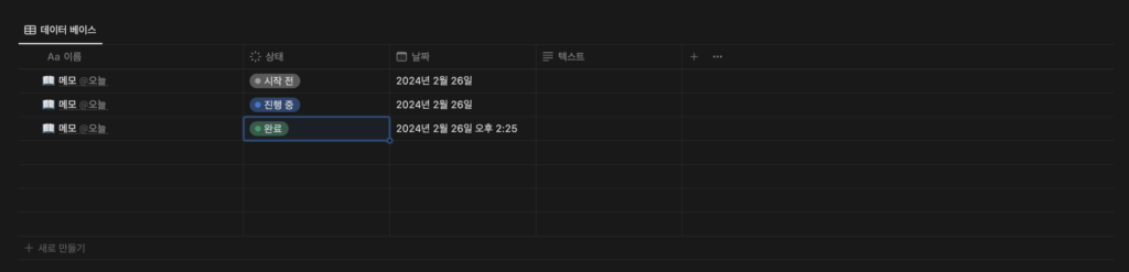 속성 추가: 원하는 속성을 추가합니다. 예시에서는 간단하게유형 - 상태와날짜를 입력합니다 (템플릿 생성 날짜 – 오늘).