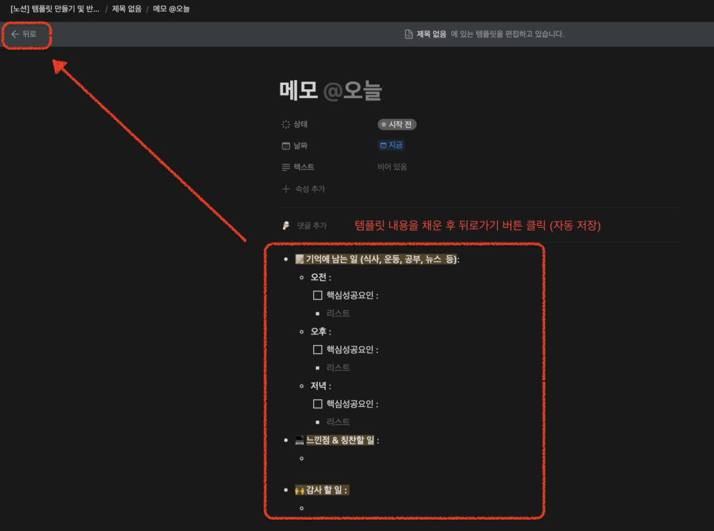템플릿 내용을 모두 작성한 후에는 ‘뒤로가기’ 버튼을 클릭합니다. 별도로 저장할 필요 없이 뒤로 가기를 선택하면 자동으로 저장됩니다. 저장된 템플릿은 ‘새로 만들기’ 아래의 화살표를 클릭하면 사용할 수 있습니다. 이렇게 생성된 템플릿은 필요할 때마다 쉽게 접근할 수 있어, 반복적인 작업을 효율적으로 처리할 수 있습니다.