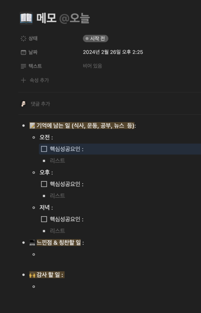 제목 + 생성날짜를 제목에 입력하고 싶다면@ 사용 후 + 오늘을 선택하면 템플릿 생성 시마다 제목에 오늘의 날짜가 입력됩니다 (왼쪽 하단 그림 참조). - 속성 – 상태: