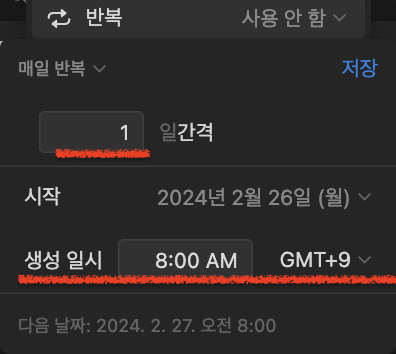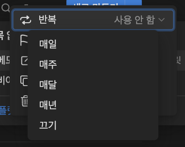 새로 만들기→ 반복할 템플릿 (점3개 클릭점 …) →반복 주기선택 → 간격 설정 및 생성일시 (GMT +9 한국)