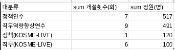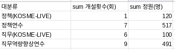 =QUERY(RAW!$A:$H,"SELECT B,SUM(F),SUM(G) WHERE G>=50 GROUP BY B",1)Q.대분류를 기준으로 개설횟수의 합, 정원의 총 합계를 구하고 합니다. (단, 조건은 정원이 50명 이상인 대분류여야 합니다.)