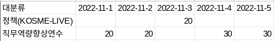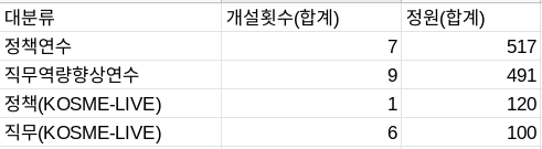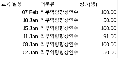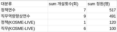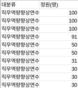 =QUERY(RAW!A:G,"select B,G WHERE B ='직무역량향상연수' order by G desc limit 10",1) // 대분류 '직무역량향상연수' 중 정원수 상위 10개를 찾아보자 (Order by와 Limit을 함께 사용해서 Top10을 구할 수 있다. //